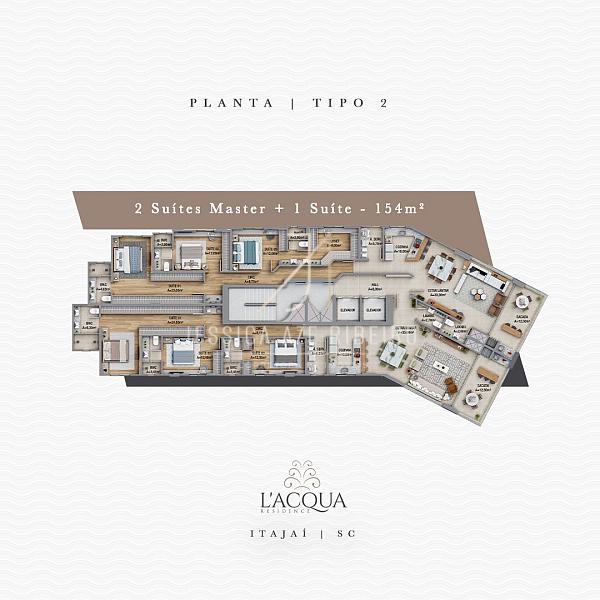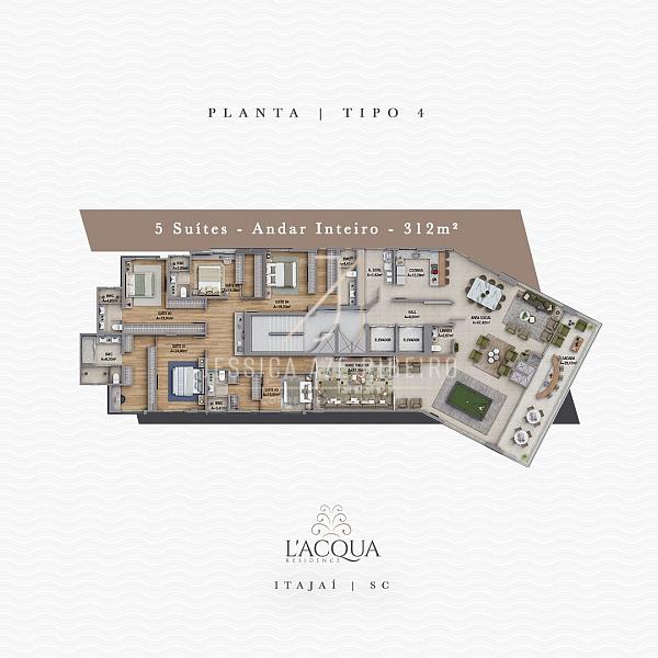 O imóvel é localizado no L'Acqua Residence, idealizado pela GPinheiro, está situado no bairro Centro de Itajaí. Oferece apartamentos de 3 a 5 quartos com áreas que variam de 158 a 419 m². O edifício conta com 17 pavimentos e duas opções de apartamentos por andar.